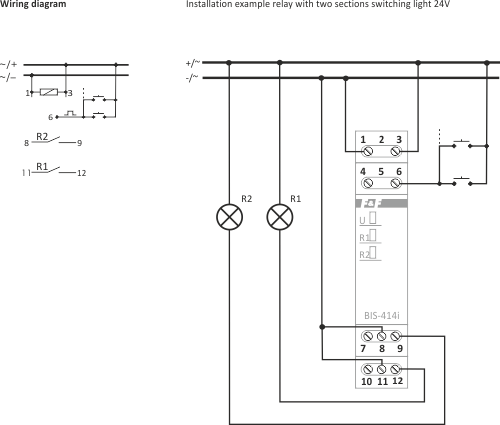 The relay have got two switch ON section and enable to switch ON in accordance sequence two circuits of lights or diferent recuiver from many places by pushbuttons connected in parallel. Switching the relay into another cycle phase is made by another current pulse triggered by pressing any bell push connected to the relay.