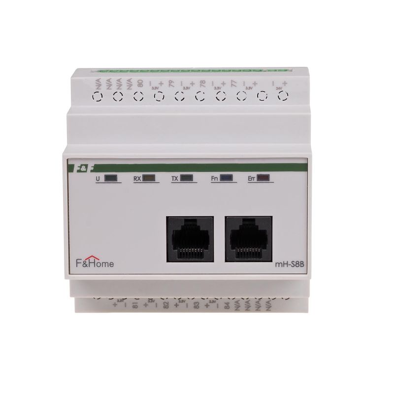 The sensors should be connected to independent three-core cables (separate cable for each sensor), preferably shielded (it can be an FTP cable). Cables should be routed in one section (without connection points) and led out in boxes under the buttons controlling lighting in a given room. The module is powered by a 24 V system power supply. The module inputs (signal from sensors) are supplied with 3.3 V. The module works in conjunction with the V valve module (via the CAN line) based on the temperature configuration entered via the touch panel. This means that correctly configured modules operate independently of the main panel and will control the temperature in the building even when the control panel is switched off. If it is required to control a larger number of heating circuits, additional modules of subsequent levels should be used, bearing in mind that the valve modules of the same level should also be used (for example, S8-1 and V8-1 or S8-2 and V8-2). Since the numbering is coinciding, the sensor module mH-S8 (level 1) and the actuator module mH-V4 (also level 1) can be used. In this way, we will get a temperature reading from eight places in the building but we will be able to control only four valves (the first four in the numbering).