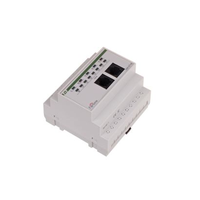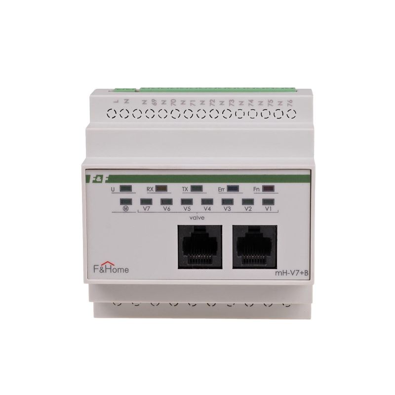 The actuator elements are semiconductor elements, thanks to which the devices have high durability (no mechanical elements - relays). In addition, the eighth actuator channel controls the central heating pump as follows: if at least one solenoid valve is switched on (open), the pump is also switched on. This function prevents the pump from running with all solenoid valves closed, which protects it from damage. The module is supplied with 230 V voltage. If it is required to control a larger number of heating circuits, additional modules of subsequent levels should be used, bearing in mind that the sensor modules of the same level should also be used (for example, S8-1 and V7+-1 or S8-2 and V7+-2). The selection of solenoid valves is very important. It is important that the coils are supplied with 230 V.