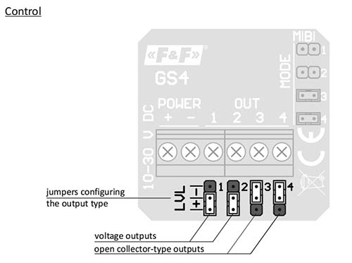 - voltage output - the output circuit is switched on by supplying positive voltage to the OUT output;