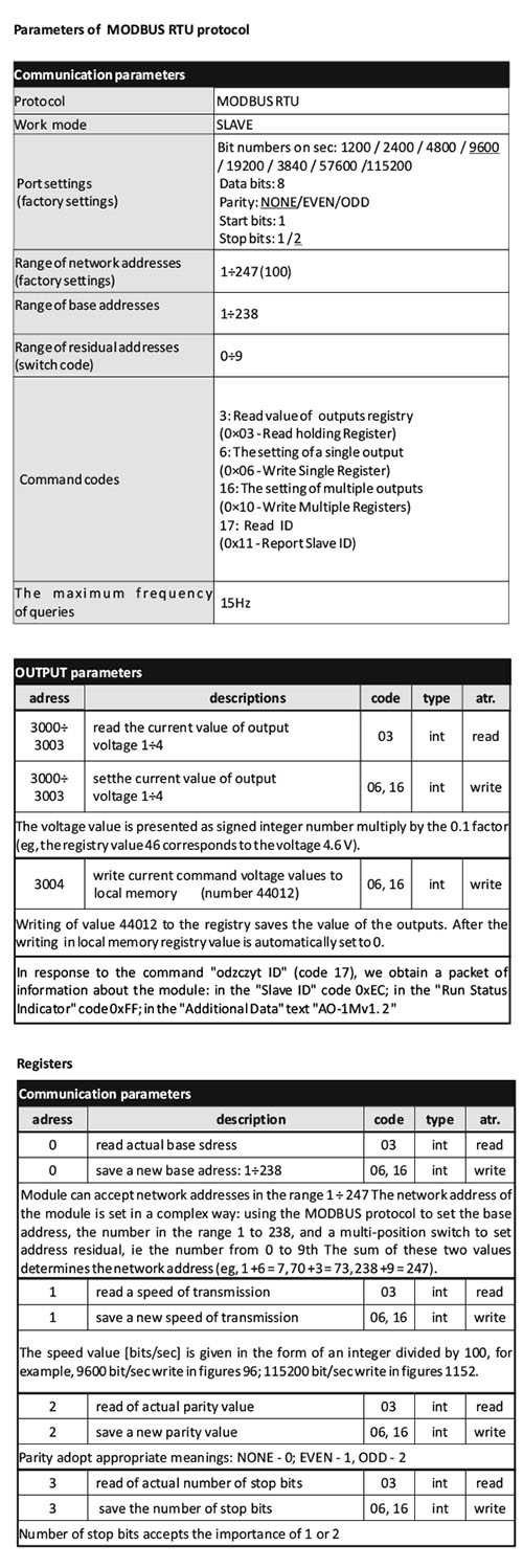 Purpose MR-AO-1 module serves as an external device which expanding analog voltage outputs of PLCs or other devices in which data exchange is via the RS- 485 according to the MODBUS RTU protocol.