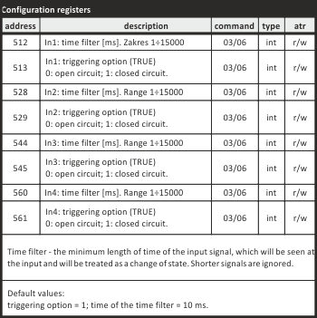 The MR-DI-4 module has four inputs. The module has configurable options for activating inputs (TRUE value) with low (0V) or high (V +) signal and with closing or opening the input signal circuit. Time filter is used for eliminating interference (false pulses) which may appear at the input. This is the setting of a minimum length of time of the input signal, which will be seen at the input and will be treated as a change of state. Shorter signals are ignored.