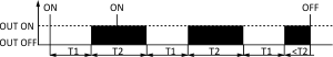 Cyclic operations OUT ON (relay on) for the time T1 and OUT OFF (relay off) for the time T2. The cycle is started by sending the ON command. The number of executed cycles depends on the 0x235 registry value. If this register is set to 0, the program will be executed cyclically until the OFF command is sent. If this registry value is other than zero (max. 65 535), the controller performs a predetermined number of cycles, then turns off. Sending the OFF command during the cycle breaks its execution and turns off the relay. The ON command received during cycle execution will be ignored. After the programmed number of cycles the next ON command starts the program from the beginning.