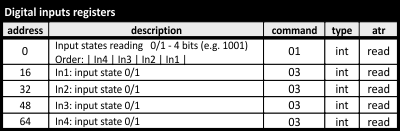 The MB-LI-4 module is a four-channel one-way counter. Each channel is independent and counts the impulses in accordance with individual settings. The results are presented in the form of a number of pulses and rescaled value in a range from 0 to ~4, 29 billion. Reading of the counter can be reset independently for each channel. Once the maximum number of pulses (overflow) is reached, counter automatically resets and counts from 0. The module has configurable options of counting pulses with low (0 V) or high (V+) signal and with leading or trailing edge.