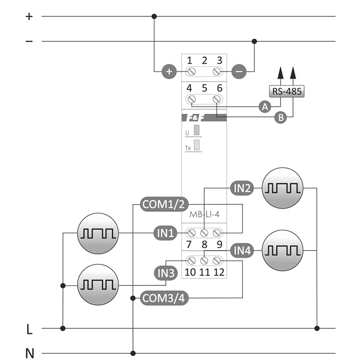 The MB-LI-4 module is a four-channel one-way counter. Each channel is independent and counts the impulses in accordance with individual settings. The results are presented in the form of a number of pulses and rescaled value in a range from 0 to ~4, 29 billion. Reading of the counter can be reset independently for each channel. Once the maximum number of pulses (overflow) is reached, counter automatically resets and counts from 0. The module has configurable options of counting pulses with low (0 V) or high (V+) signal and with leading or trailing edge.
