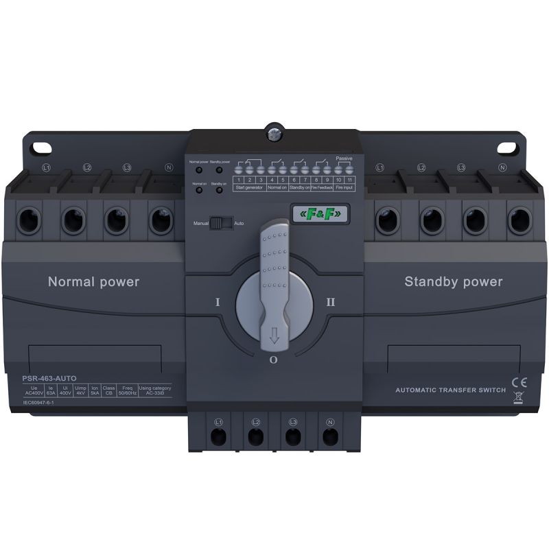 The PSR-463-AUTO automatically switches the power supply between the main and auxiliary mains, e.g. between two supply lines or between a supply line and a generator, ensuring continuity of equipment operation. It is designed for operation on AC 50/60 Hz networks with a voltage of 230/400 V. It can handle currents up to 63 A.