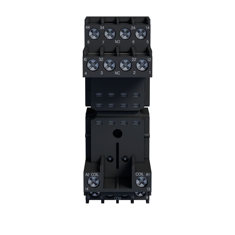 Relay socket 4P (four NO/NC changeover contacts) on DIN rail TH-35 with load capacity up to 7 A. Designed for PG-4P relays supplied with 24 V DC or 230 V AC. It has an electrical strength of 2500 V.