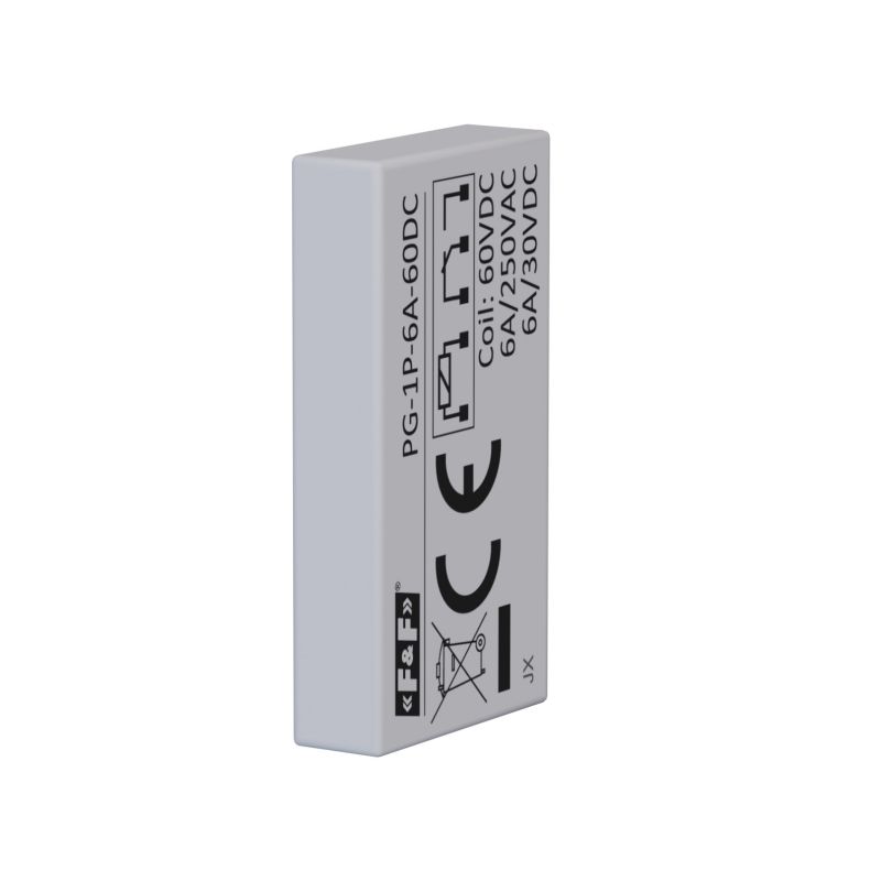 Interface relay with one contact (1P), coil for 60 V DC and 6 A load capacity. Relay designed for use in systems requiring higher control voltages. The compact design (5.2 mm wide) and AgSnO₂ contact material ensure reliable operation in automation systems. Works with the GN-1P-24 socket.
