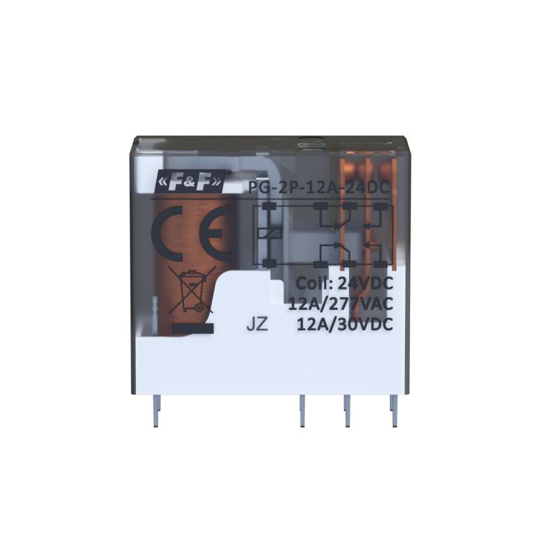Interface relay with two contacts (2P), 24 V DC coil and 12 A load capacity. The contact material AgSnO₂ ensures reliable operation in industrial applications. Works with the GN-2P-M socket outlet.