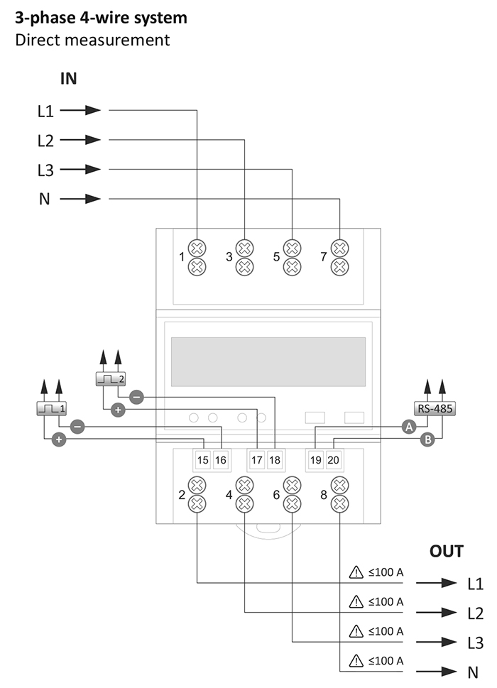 3-phase, bidirectional, 4-quadrant electricity meter, direct measurement up to 100A.