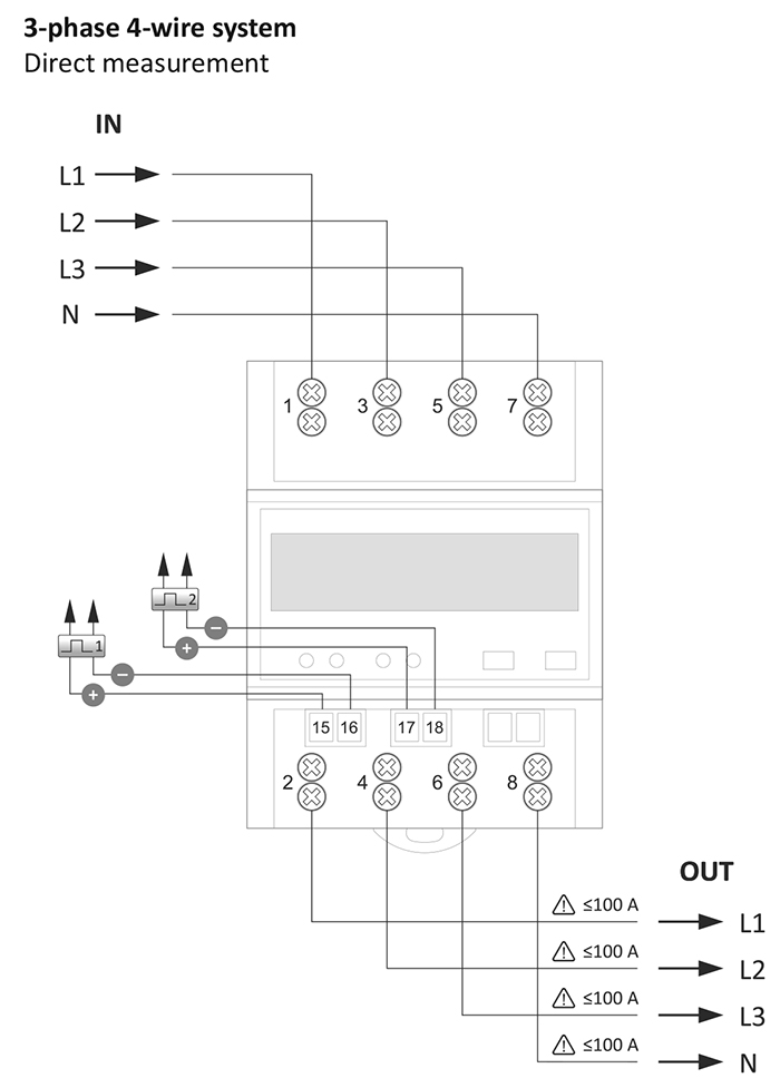 3-phase, bidirectional, 4-quadrant electricity meter, direct measurement up to 100A.