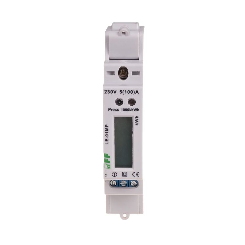 Under the influence of flowing current and applied voltage, the LE meter accurately measures the amount of consumed electricity. Energy consumption is indicated by flashing LED (1000 pulses/kWh). In addition, the device measures the mains parameters and the temperature of its own system. The values are displayed cyclically on LCD display. Parameter changes every 3 seconds. Indicated values: active power (0.1 kWh); voltage (0.1V); current intensity (0.1A).