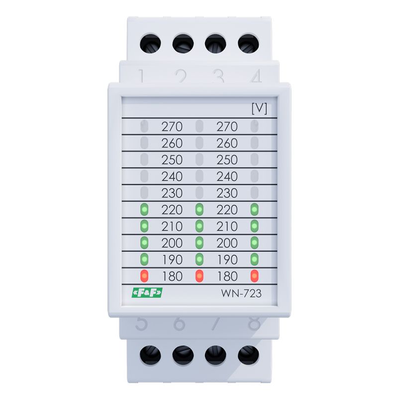 Voltage range indicated for each phase ranged from 205V to 245V with an accuracy 2,5V. The illumination of LED indicates the voltage is described at its height. If two light LED voltage value is the average of the values described in their heights. The value of the voltage tolerance range (215V to 245V) is indicated LED luminous green, the other values are indicated in LED red light. Voltage equal to or higher than 250V is indicated highest luminous LED red ≥. Voltage equal to or less than 200V is indicated lowest luminous LED red ≤.