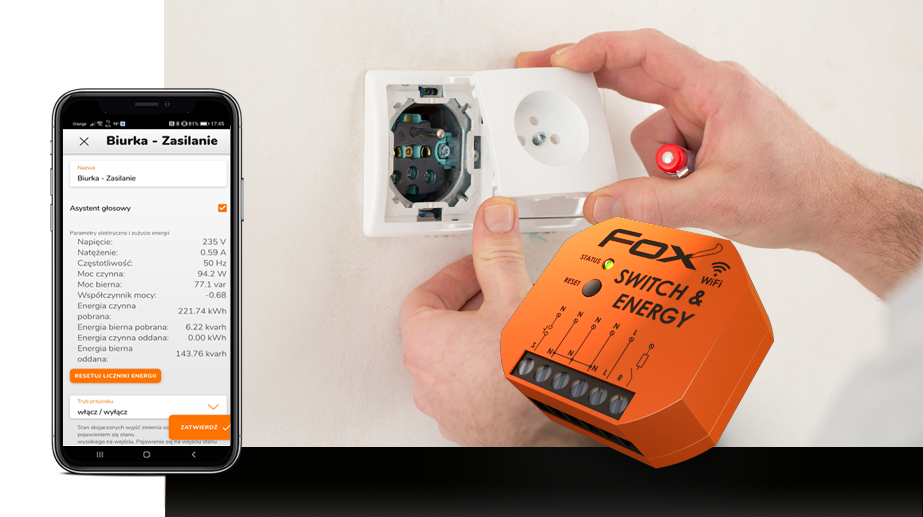 SWITCH & ENERGY daje możliwość zdalnej kotroli włącz/wyłącz dla urządzeń elektrycznych w domu. Możesz włączyć dowolne urządzenie lub automatycznie ją odłączyć za pomocą aplikacji w telefonie. Moduły SWITCH & ENERGY w połączeniu z aplikacją FOX pozwalają zdalnie kontrolować domowy sprzęt AGD.