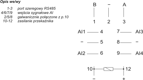 Moduł posiada cztery uniwersalne wejścia analogowe. Typ wejścia zgodny ze standardem 0÷10 V (napięciowe U) lub 4÷20 mA (prądowe I) ustala się za pomocą wewnętrznych zworek. Moduł dokonuje ciągłego pomiaru wartości wejściowych prądu i napięcia na wszystkich wejściach bez względu na konfigurację sprzętową typów wejść (położenie zworek). Jednakże poprawnie mierzone będą te wartości wejściowe dla jakich te wejścia skonfigurowano. Wartości wejściowych prądów lub napięć oraz nastawę wszystkich parametrów komunikacji realizujemy poprzez port RS-485 za pomocą protokołu komunikacyjnego MODBUS RTU. Załączenie napięcia zasilania sygnalizowane jest świeceniem LED zielonej U. Poprawna wymiana danych między modułem i drugim urządzeniem sygnalizowana jest świeceniem LED żółtej Tx.