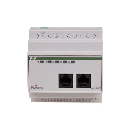 Moduł mH-E16 steruje roletami zewnętrznymi (antywłamaniowymi) zasilanymi silnikami 230 V lub 24 V. Sterownik rolet inteligentnego domu F&Home pozwala również na sterowanie żaluzjami pionowymi i poziomymi. Moduł montujemy w rozdzielni. Zajmuje w niej pole 6 modułów. Zasilany jest napięciem 24 V. Do wejść modułu sprowadzane są przyciski rozlokowane w budynku. Podłączone są za pomocą przewodów typu UTP. Moduł zarządza silnikami rolet lub żaluzji za pośrednictwem przekaźnikowych modułów wykonawczych typu mH-RE4. Kierunek ruchu przesłon okiennych to góra-dół lub prawo-lewo. Sterowanie odbywa się w pełni po linii niskiego napięcia 24 V. Zapewnia to bezpieczeństwo i możliwość dowolnego rozmieszczenia przycisków sterujących w budynku. Moduł mH-E16 komunikuje się z panelami dotykowymi poprzez magistralę CAN. Dowolne wyjście modułu wyzwalamy z poziomu paneli dotykowych. Wybieramy konkretne urządzenie lub scenę, czyli grupę urządzeń. Z poziomu panelu dotykowego można zaprogramować czas samoczynnego załączania/wyłączania urządzeń sterowanych z modułu mH-E16.