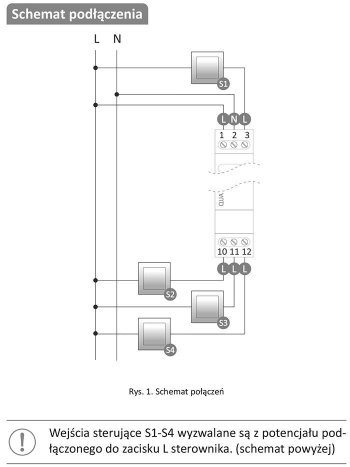 Moduł zamontowany w puszce podtynkowej i podłączony do czteroprzyciskowego chwilowego włącznika może pełnić funkcję centralnego sterowania roletami.