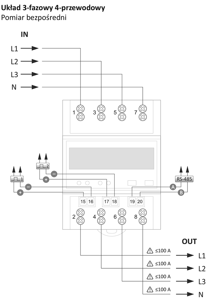 bezpośredni pomiar prądów do 100 A w układzie 3-fazowym, 4-przewodowym;