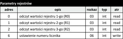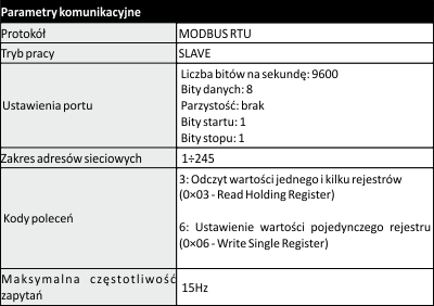Komunikacja z licznikiem przy wykorzystaniu interfejsu komunikacyjnego RS-485 obsługującego standard Modbus RTU.