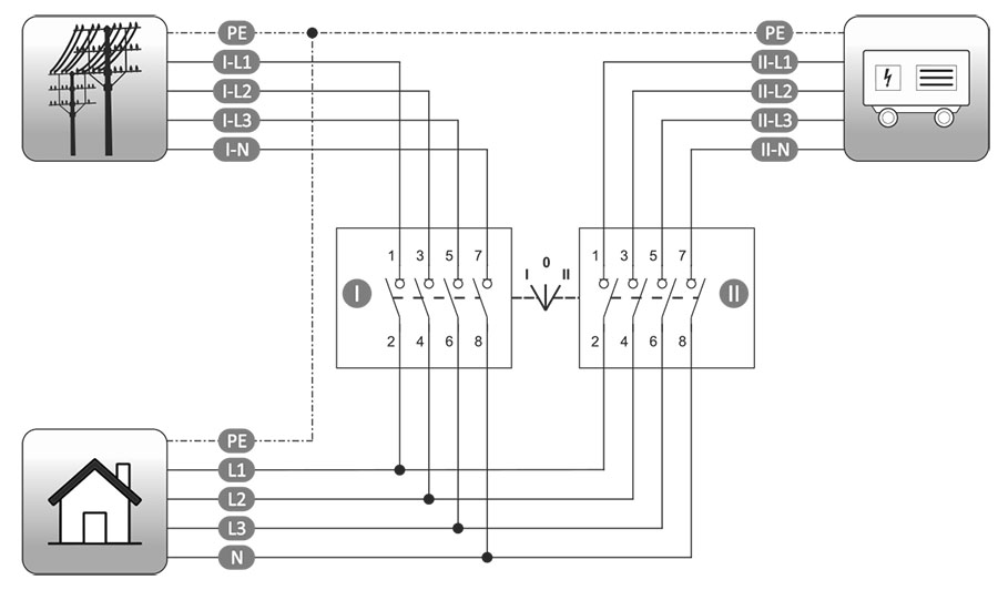 Modułowe przełączniki instalacyjne sieć-agregat realizują program przełączeń 1-0-2, dzięki czemu możliwe jest np. podłączenie do wyjścia jednej z dwóch linii wejściowych, lub całkowite rozłączenie obwodów. Możliwe jest dokonywanie przełączeń do znamionowego prądu obciążenia.