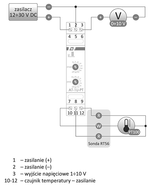 Przetwornik temperatury AT-1U-PT przeznaczony jest do pomiaru temperatury przy wykorzystaniu 3-przewodowego czujnika platynowego PT100 i przekształcaniu wyniku pomiaru do postaci analogowego sygnału napięciowego w zakresie 1÷10 V.